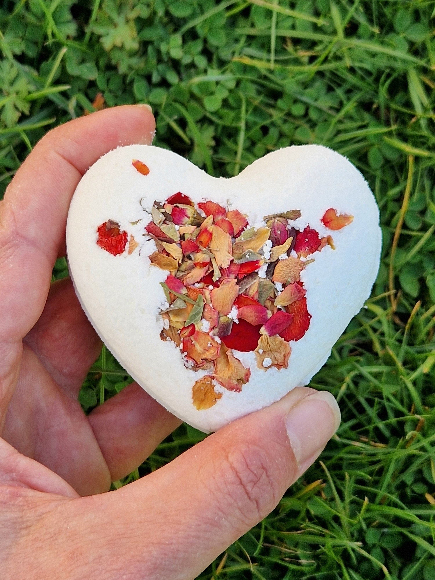 ROSE HUG bath bomb is enriched with few drops of Rose and Geranium Essential Oil, contains Epsom Salt and Peach oil to make your skin soft, bath bomb is decorated with Rose petals