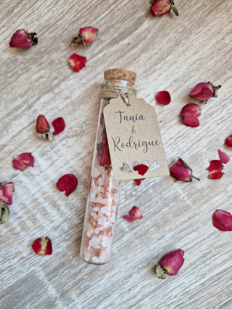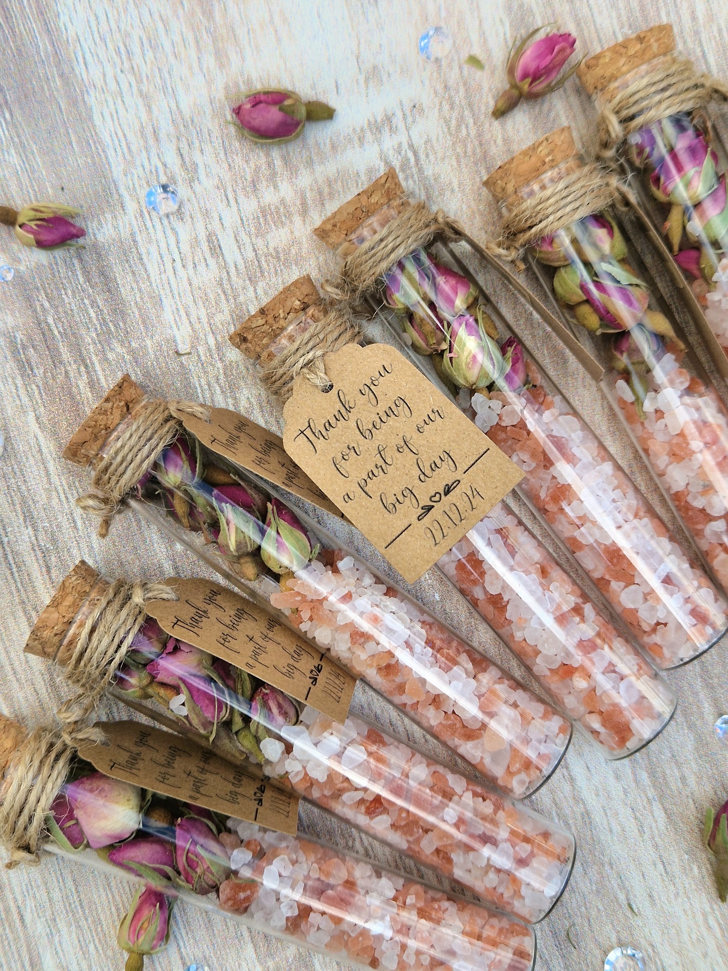 Celebrate your special day with our personalised wedding bath salt favours, presented in elegant, reusable glass vials. Each wedding bath salt favour is adorned with rose decorations – pink, red, or orange – and customised with a personal tag.