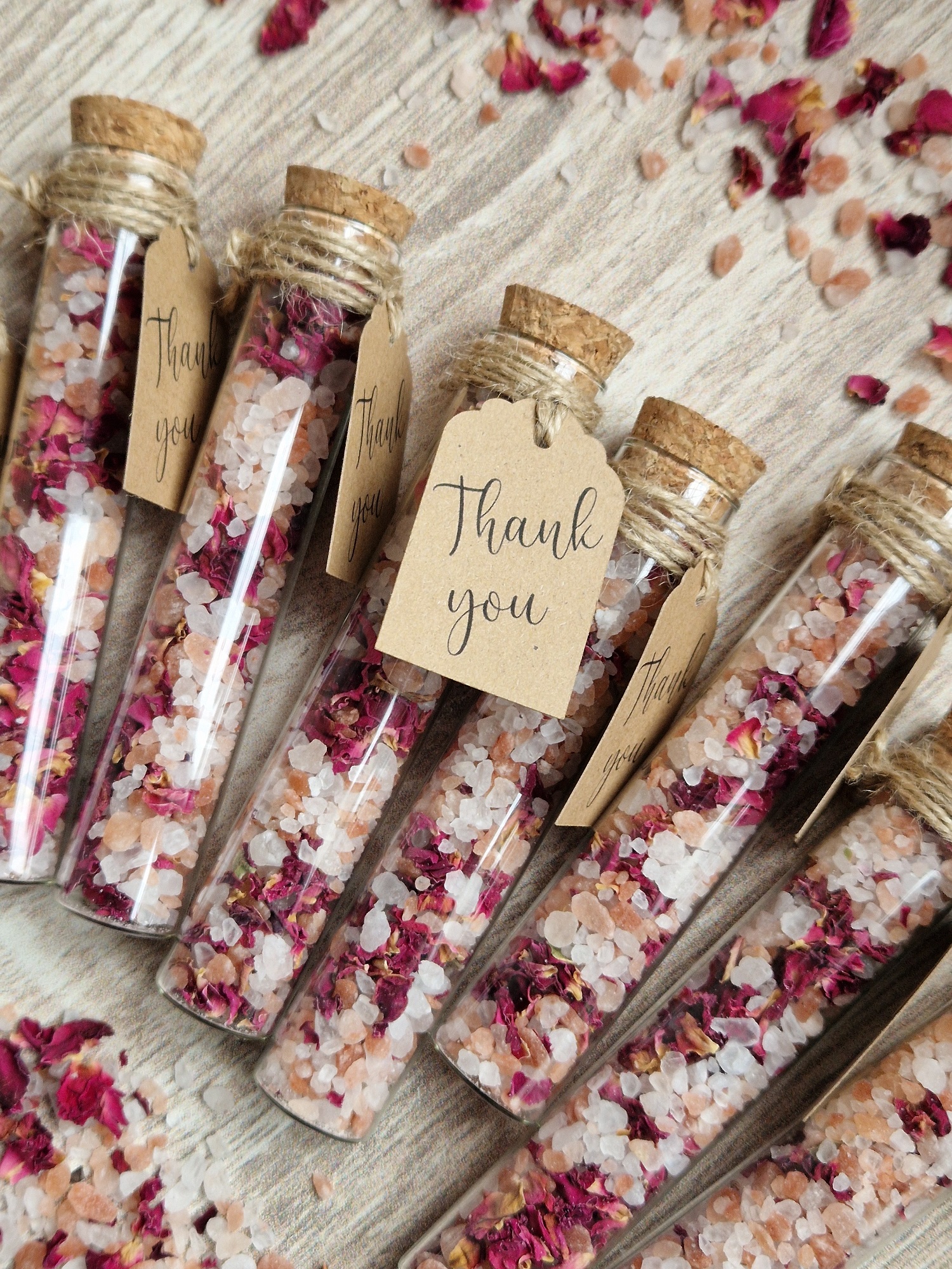 These eco-friendly wedding bath salt favours are fully reusable and add a bespoke touch to your wedding celebration. The bath salt come in a cute 30ml glass tube with a cork top. The size of the tube is 22 x 120 mm which is perfect size for your wedding table. The tube can lay or stand on your table.
